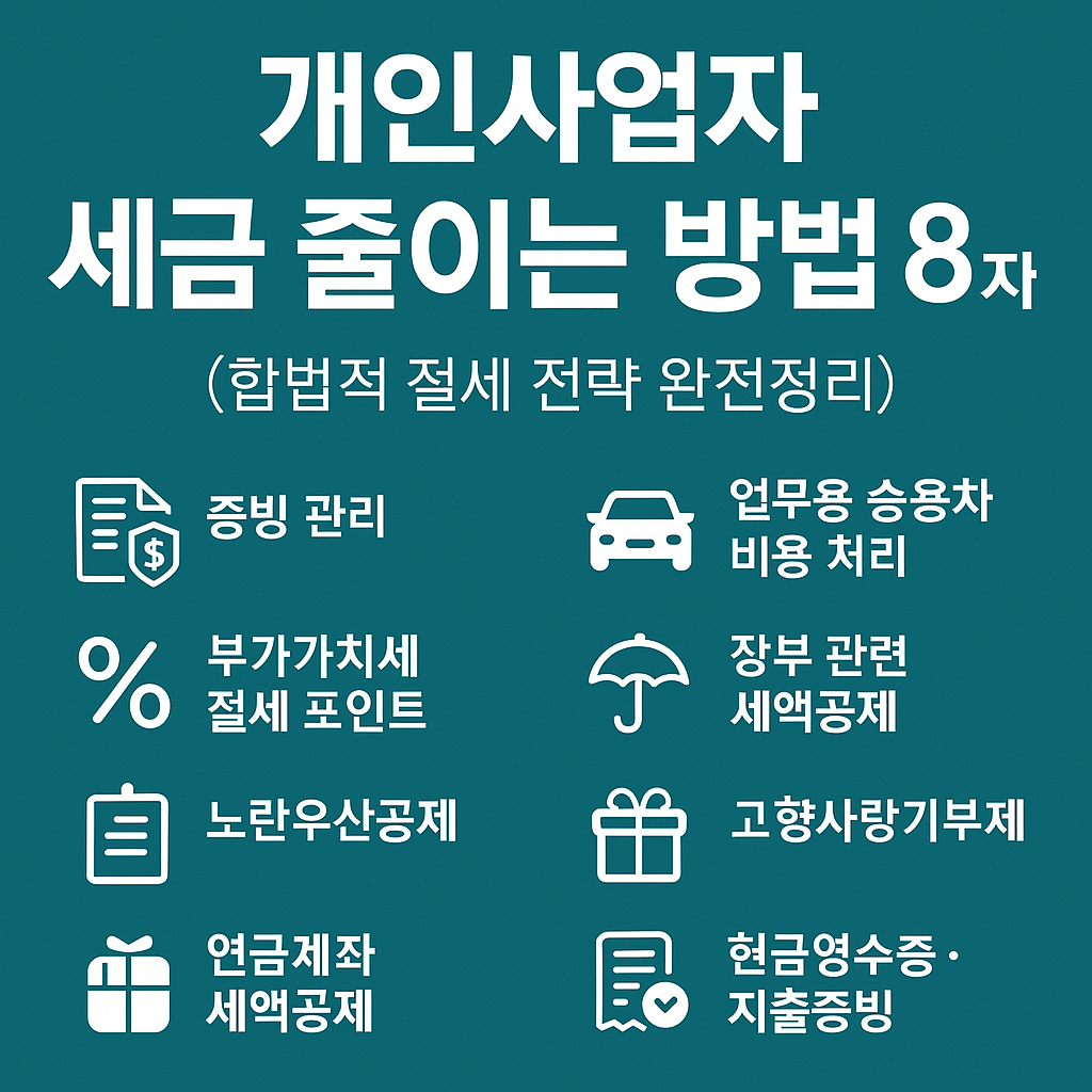 개인사업자는 증빙 관리, 부가세·종소세 공제, 차량 비용 처리, 연금·공제상품 활용만 제대로 해도 세부담을 크게 줄일 수 있습니다. 아래 8가지를 체크리스트처럼 따라 해보세요. (법령은 수시 개정되므로 최종 신고 전 세무사와 확인을 권장합니다)