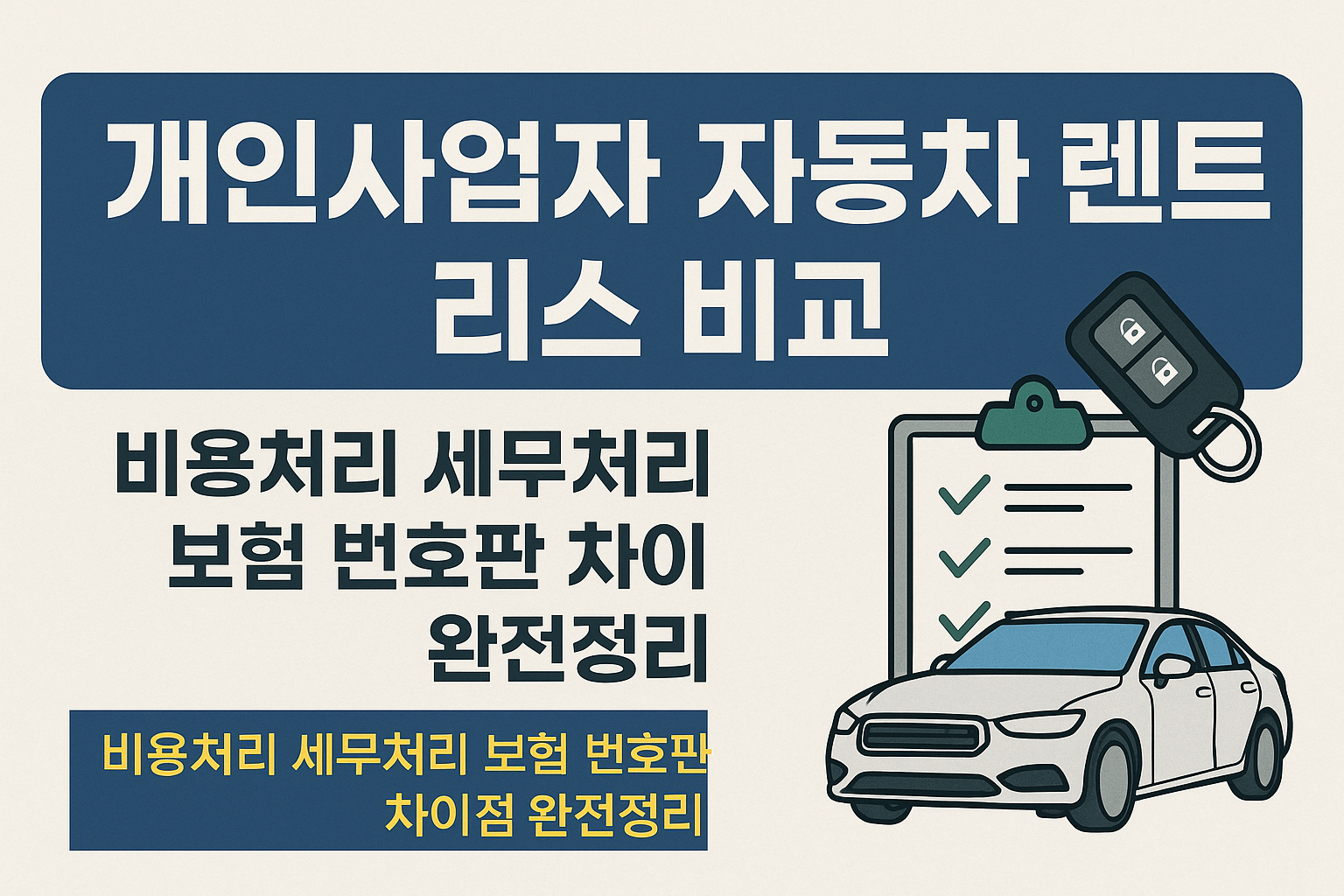 개인사업자 자동차 렌트 vs 리스는 업무용 차량 선택 시 반드시 고민하게 되는 중요한 선택지입니다. 월 납입금은 비슷해 보여도 비용처리 방법, 세무 한도, 보험 처리, 번호판 종류, 만기 처리 방식에서 큰 차이가 있습니다. 이 글에서는 개인사업자가 꼭 알아야 할 렌트와 리스의 모든 차이점을 비교하고, 상황별 최적 선택 가이드를 제공합니다.