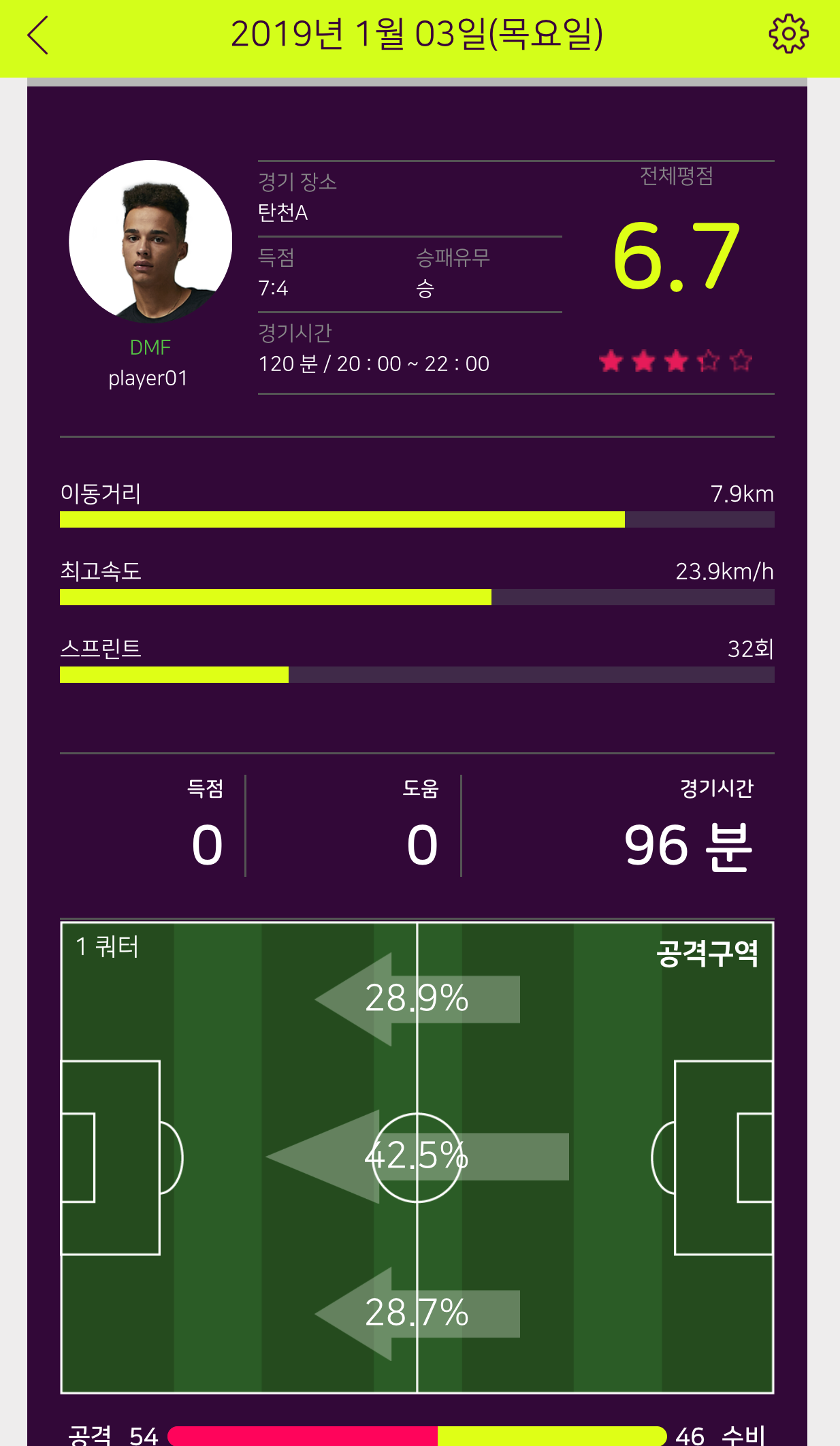 경기 종료 후 2분이 지나면 핸드폰 어플을 통해 아래의 화면들을 통해 스프린트횟수, 최대속도, 이동거리, 히트맵 등등의 다양한 자신의 데이터를 확인하실 수 있답니다.