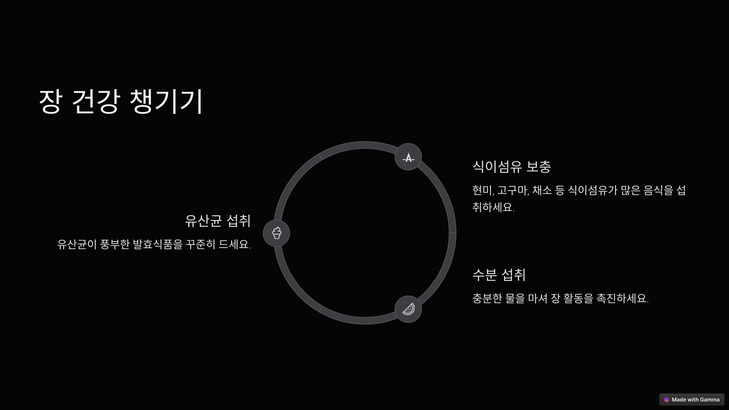 - 발효식품(김치, 요거트, 된장)으로 장 건강 강화
