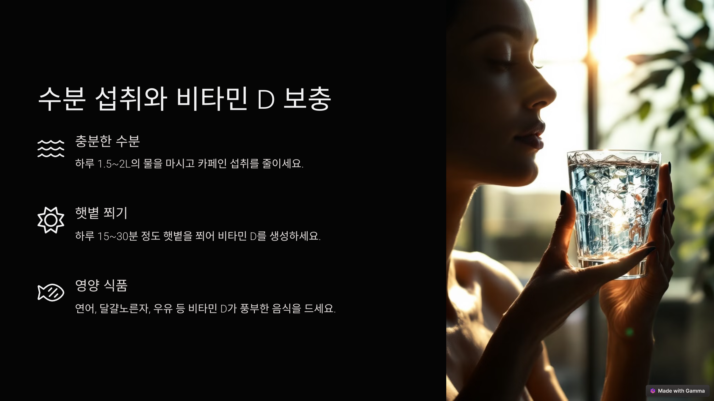 - 비타민 D가 풍부한 음식(연어, 달걀노른자, 우유) 섭취