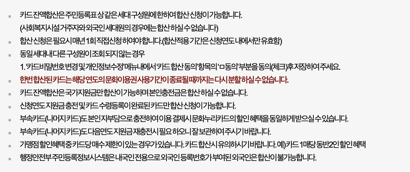 - 세대 기준 중복 가능(개인별 카드 발급), 세대 합산은 별도 신청