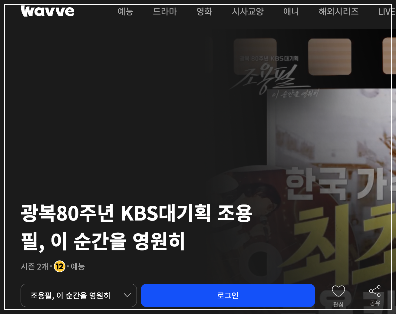 - Wavve 앱/웹 접속 → 검색창에 “조용필, 이 순간을 영원히” 입력