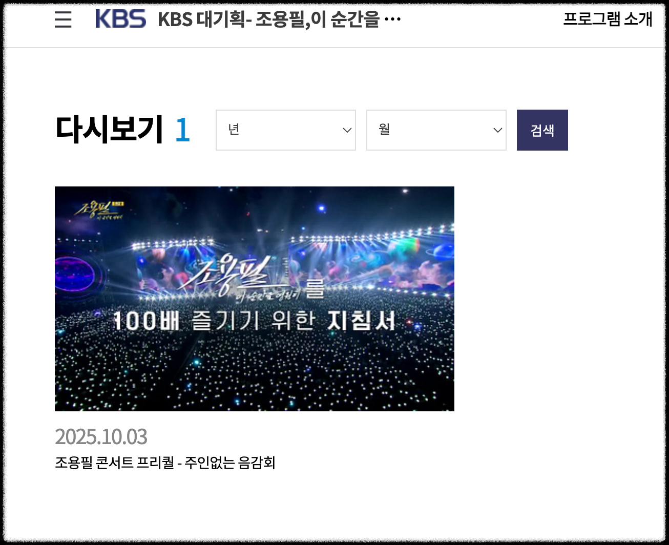 - KBS 편성표에서 프로그램명 검색(재방 편성 시 전일·당일 자정대 시간대 편성되는 사례 多)