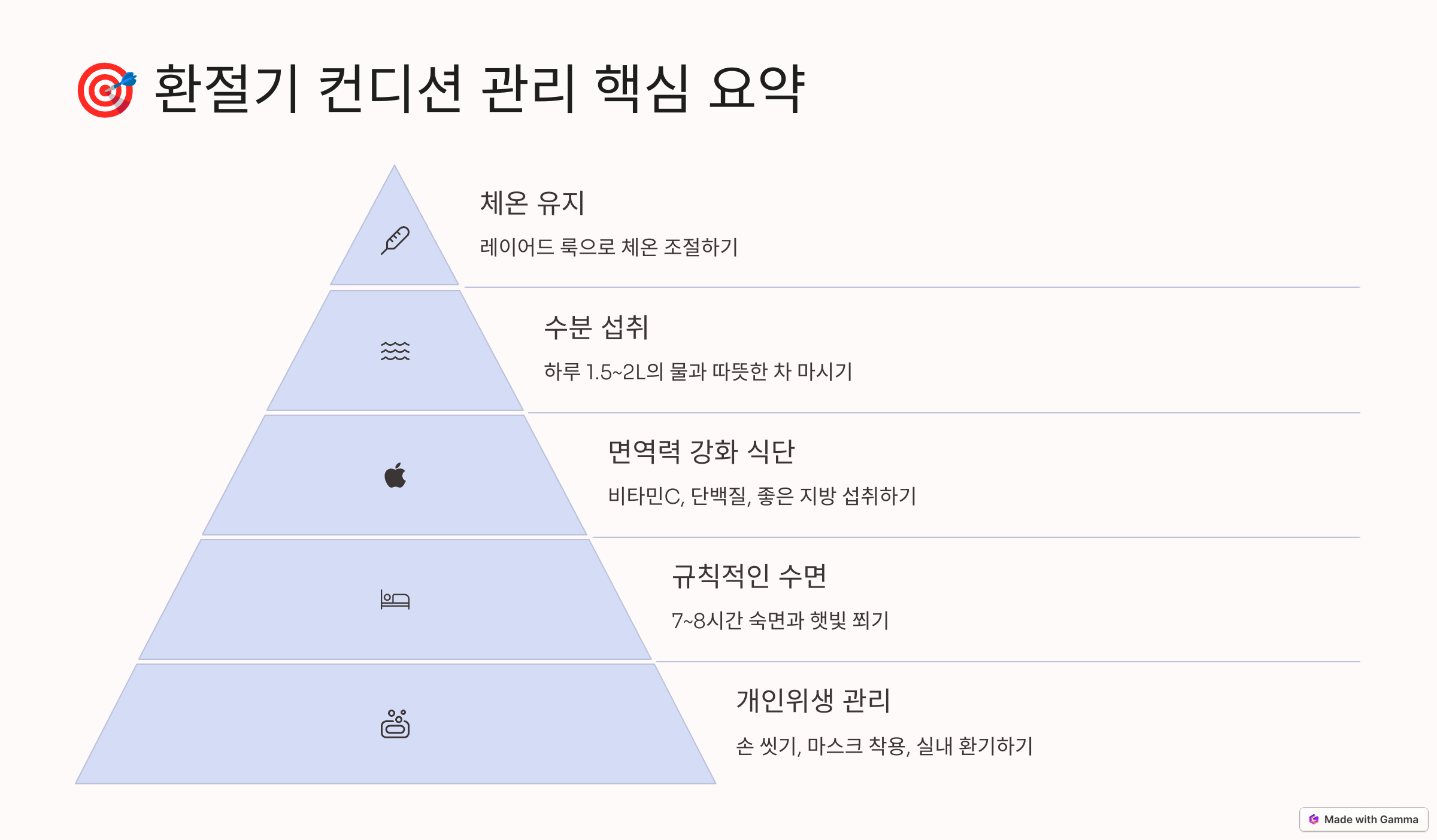 하지만, 체온 유지, 충분한 수분 섭취, 면역력 강화 식단, 규칙적인 수면, 개인위생 관리만 잘 지켜도 컨디션을 안정적으로 유지할 수 있습니다.