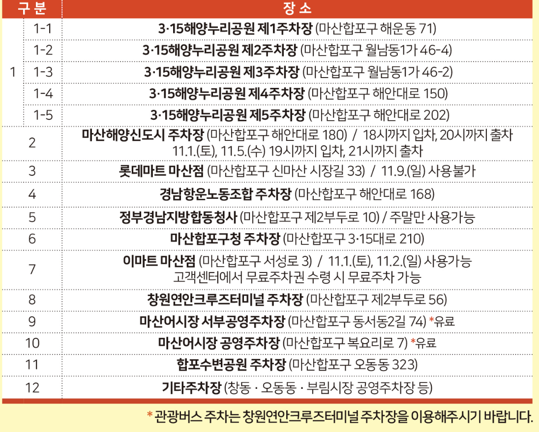 | 제1주차장 | 해운동 71 (3·15 해양누리공원 내부) | 가장 가까운 주차장, 조기 만차 예상 |
