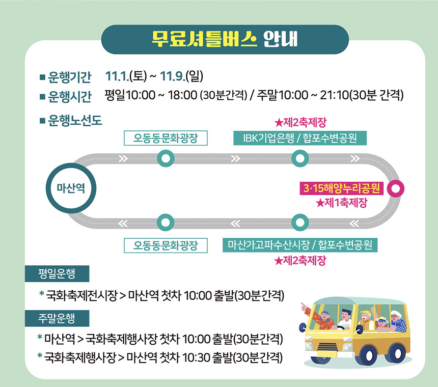 • 셔틀 정류장은 행사장 입구 및 마산역 광장 앞에 위치