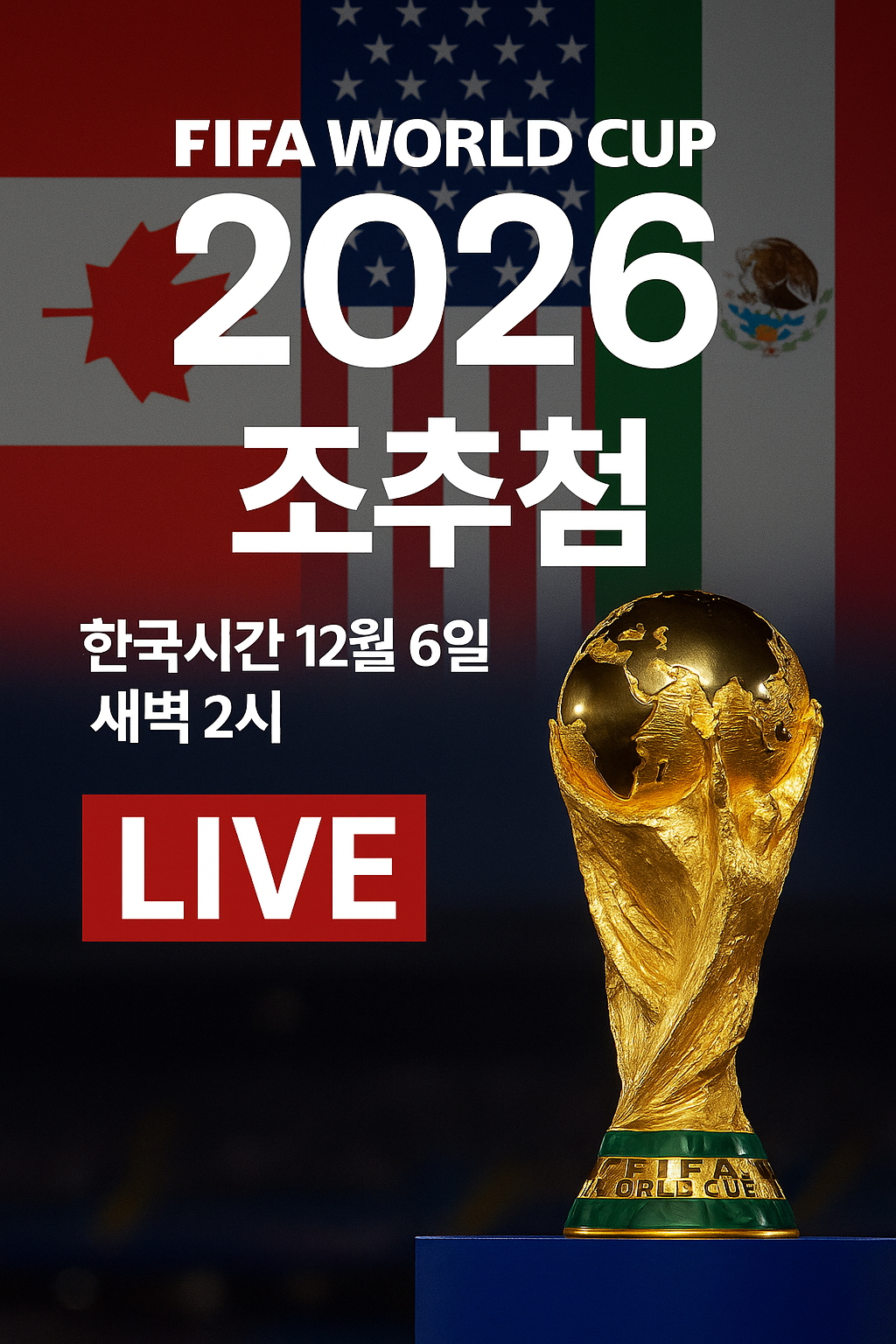 2026월드컵 조추첨은 한국시간으로 2025년 12월 6일(토) 오전 2시에 진행되며, 북중미 3개국 공동 개최, 48개국 참가, 104경기 규모의 역대 최대 대회입니다. 한국 대표팀의 조 편성 결과는 이 시간에 공식 발표됩니다.