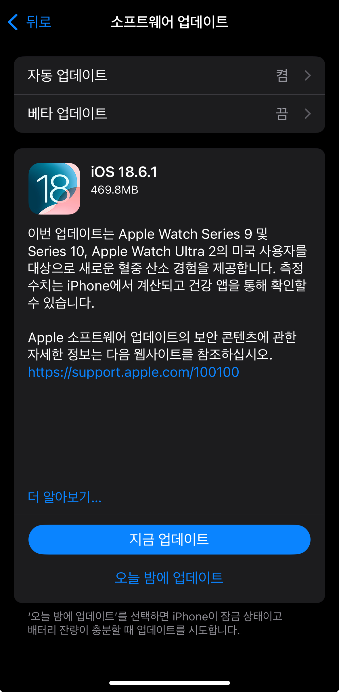 Apple 보안 출시 페이지(한국어) 기준으로 최신 iOS는 18.6.1로 표기되어 국내 사용자도 설정 > 일반 > 소프트웨어 업데이트에서 확인·설치할 수 있습니다. 다만 기능 측면의 변화(혈중 산소 재설계)는 미국 사용자 대상임을 유의하세요.